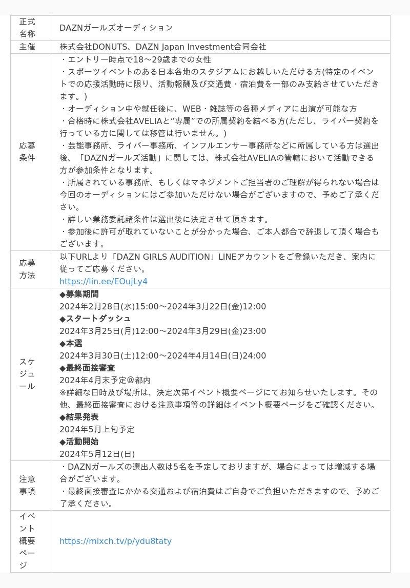 この度開催する「DAZNガールズオーディション」は、「ミクチャ」でのライブ配信と動画投稿での獲得ポイントによる審査、2024年4月末に都内会場にて実施予定の最終面接審査を経て、「DAZNガールズ」5名(予定)を選出いたします。