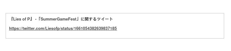 このイベントには『Lies of P』として出展を予定しておりますので、ぜひ当日は「SummerGameFest」にご注目ください。
