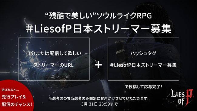 本オーディションで選出された上記のインフルエンサーの皆様には“『Lies of P』公認インフルエンサー”の称号とともに、今後の『Lies of P』ゲームプレイ機会の提供をはじめとした『Lies of P』の情報発信をいち早く発信できる特典を授与しております。
