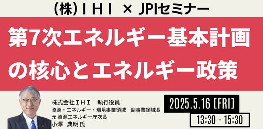JPI(日本計画研究所)は、株式会社IHI 執行役員 資源・エネルギー・環境事業領域 副事業領域長 小澤 典明 氏を招聘し、第7次エネルギー基本計画の核心とエネルギー政策について詳説いただくセミナーを開催します。