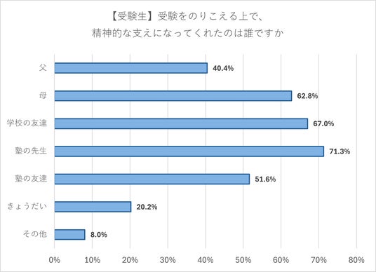 受験生に、受験をのりこえる上で精神的な支えとなった人を聞いたところ、「塾の先生」が71.3%と最も高く、次いで「学校の友達」が67.0%、「母」が62.8%だった。周囲の大人の支えだけでなく、同じ受験生である学校や塾の友達と、受験の大変さを共有したり、互いに励まし合ったりなど、助けられたと感じている受験生も多いようだ。