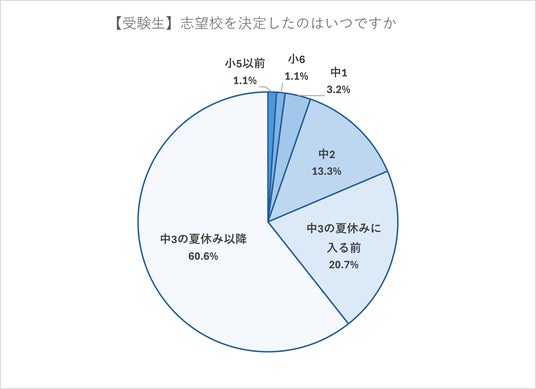受験生に、志望校を決定した時期を聞いたところ、最も多かったのは「中3の夏休み以降」で60.6%だった。次いで「中3の夏休みに入る前」は20.7%だった。