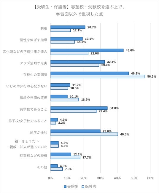 志望校・受験校を選ぶ上で、学習面以外について重視したポイントを、受験生・保護者にそれぞれ聞いた。