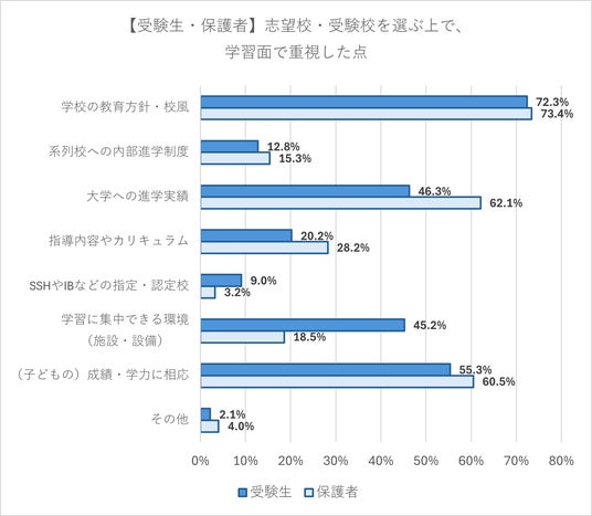 志望校・受験校を選ぶ上で、学習面について重視したポイントを、受験生・保護者にそれぞれ聞いた。