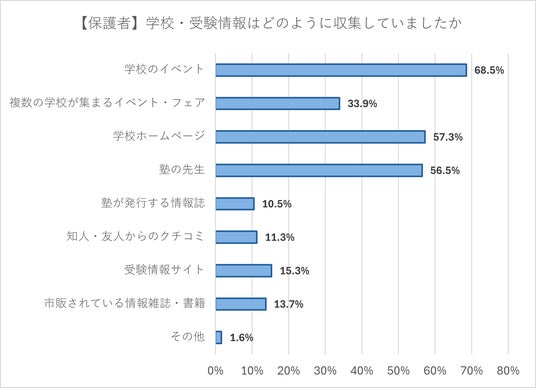 保護者に、学校や受験情報をどのように収集していたか聞いたところ、「学校のイベント」が68.5%と最も多く、次いで「学校ホームページ」が57.3%と、学校が発信している情報を多くの保護者が活用していることが分かった。