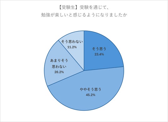 受験生に、受験を通じて勉強が楽しいと感じるようになったかを聞いたところ、「そう思う」23.4%、「ややそう思う」45.2%だった。約7割の受験生が「勉強が楽しい」と感じるようになったことが分かった。