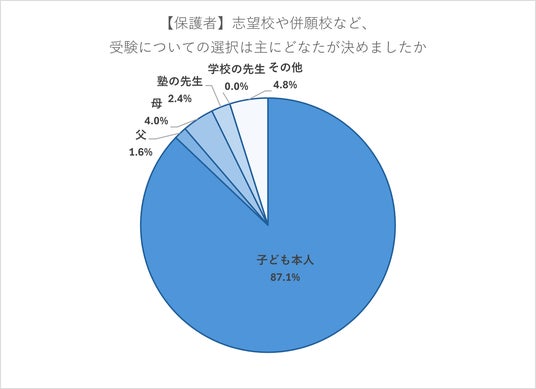 受験生の保護者に、受験についての選択は主に誰が決めたかを聞いたところ、87.1%の保護者が「子ども本人」と回答した。