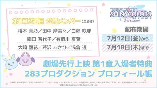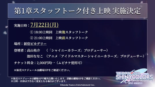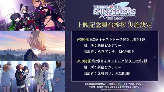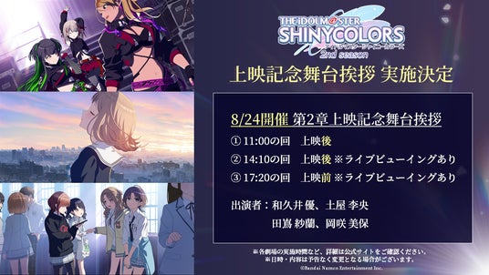 株式会社バンダイナムコエンターテインメントは、アニメ『アイドルマスター シャイニーカラーズ 2nd season』(以下、シャニアニ2nd)劇場先行上映 第2章上映記念舞台挨拶&ライブビューイングの実施が決定したことをお知らせいたします。
