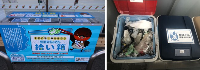 「野洲のおっさん拾い箱」は、高さ95cm、幅180cmのケースに、海洋ごみの8割は街からのごみだということや清掃活動へのメッセージが書かれ、中はごみを分別して収納できるようになっています。設置期間中はセブン-イレブン店舗でごみ拾い用の袋の配布なども行われ、いつでも気軽に清掃活動を行うことができます。
