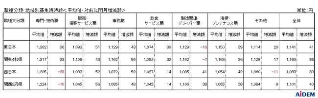 職種大分類別の平均時給は、「専門・技術職」1,224円(前年同月比10円減)、「製造関連・ドライバー職」1,106円(同38円増)、「事務職」1,085円(同48円増)、「清掃・メンテナンス職」1,065円(同38円増)、「販売・接客サービス職」1,045円(同56円増)、「飲食サービス職」1,043円(同14円増)の順で、前年同月比でプラスが5職種、マイナスが1職種となった。府県別の平均時給は、大阪府1,138円(前年同月比44円増)、京都府1,086円(同34円増)、兵庫県1,056円(同39円増)の順となり、前年同月比で全ての府県がプラスとなった。