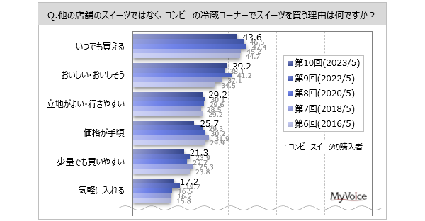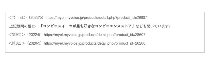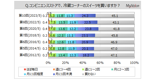 マイボイスコム株式会社(東京都千代田区、代表取締役社長:高井和久)は、10回目となる『コンビニスイーツ』に関するインターネット調査を2023年5月1日~5日に実施しました。本調査のコンビニスイーツは、コンビニエンスストアの冷蔵コーナーにあるスイーツが対象です。常温の菓子やアイスクリームは除きます。調査結果をお知らせします。