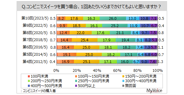 コンビニスイーツの購入金額は、1回あたり「250円~300円未満」がボリュームゾーンとなっています。200円未満は3割弱で、2014年以降減少傾向です。一方で250円以上は増加傾向、購入価格帯が上がっていることがうかがえます。