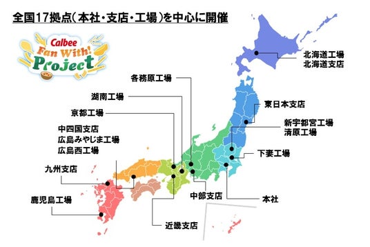 この度、より多くのファンの皆さまとお会いし、繋がりを深めたいという想いから、カルビー初の全国規模のファンミーティング『Fan With! Project』を実施する運びとなりました。当プロジェクトではカルビーが約1年かけて全国17カ所にある拠点を中心に巡り、総勢600名以上のファンの皆さまに会いに行きます。カルビーの工場や支店、工場、契約生産者の畑などを会場として、カルビー社員との交流や当プロジェクトでしか体験できない特別な企画を楽しんでいただけます。カルビーのスマートフォンアプリ「カルビー ルビープログラム」から応募できます。カルビー社員だけでなく、カルビーファンのみなさまといっしょに作り上げる、楽しくて“おいしい”ファンミーティングに是非ご期待ください。
