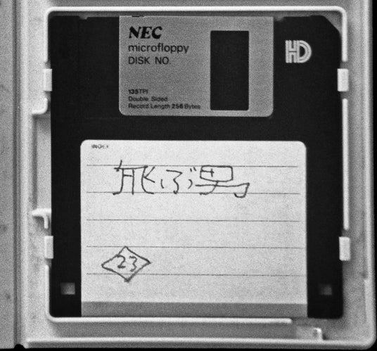 『飛ぶ男』は安部公房が1993年に急性心不全で急逝した後、愛用していたワープロのフロッピーディスクの中から発見された未完の絶筆です。その黒のフロッピーディスクには安部公房独特の筆跡で「飛ぶ男」と書かれており、その下にひし形で囲った「23」という番号が振られています。遺作がデータとして残されていたというのは、安部公房が日本文学史上初のことだと言われており、まさにワープロを日本の作家で初めて取り入れ、また日本最初期のシンセサイザーユーザーでもあった、未来志向のメカ好きだった安部公房ならではのエピソードと言えます。