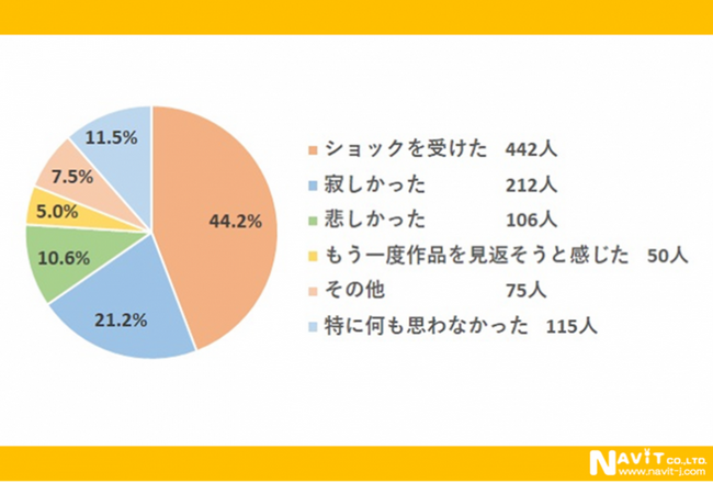 鳥山明さんの訃報を聞いた時の感想は「ショックを受けた」が最も多くて442人。「寂しかった」212人、「悲しかった」106人、「もう一度作品を見返そうと感じた」50人がこれに続きました。