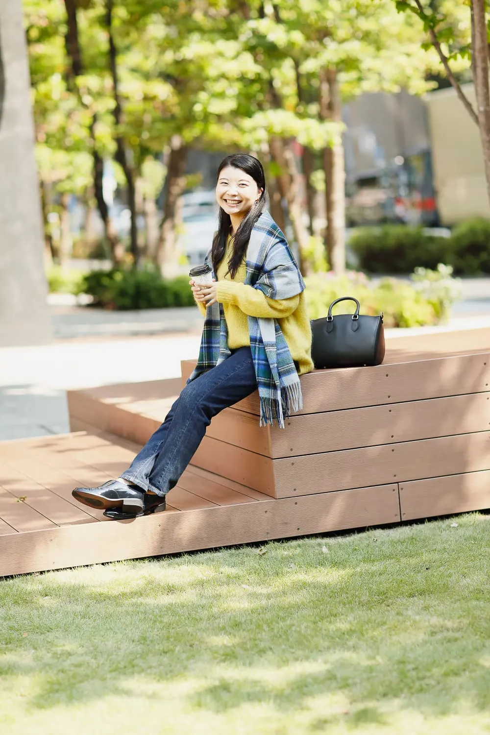 ポップで元気な印象のイエローは、ネイビーと相性の良いカラー。デニム合わせで、ヘルシーで瑞々しいカジュアルコーデにしました。ブルー系のストールが程よいアクセント。チェックのラインから、ブラックのバッグを合わせました。丸みのあるデザインなら、キリリとしたブラックでもイエローの持つ明るいイメージにマッチします。