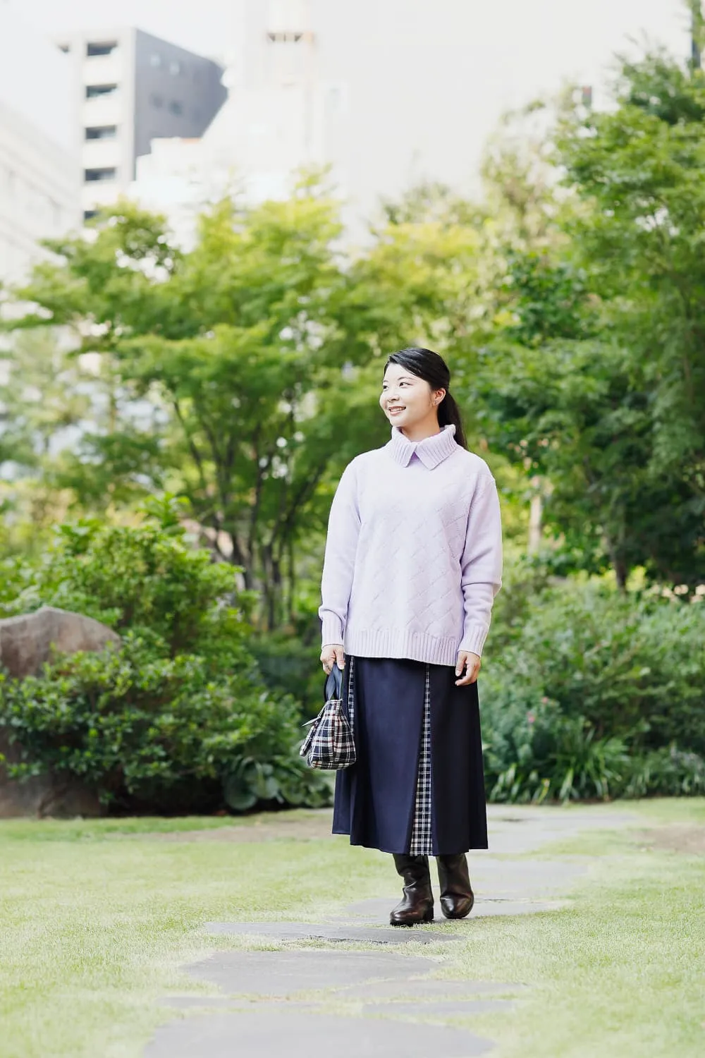 温かみのあるラベンダーニットに、ネイビーのスカートを合わせれば、品よく柔らかな雰囲気のお出かけコーデに。スカートからのぞくニューヨーカータータンを、バッグとリンクさせてまとまりを持たせ、ロングスカート×ロングブーツでトレンド感を取り入れました。アクセサリーはシルバーをチョイスすると、ラベンダーの優しさが活きてきます。