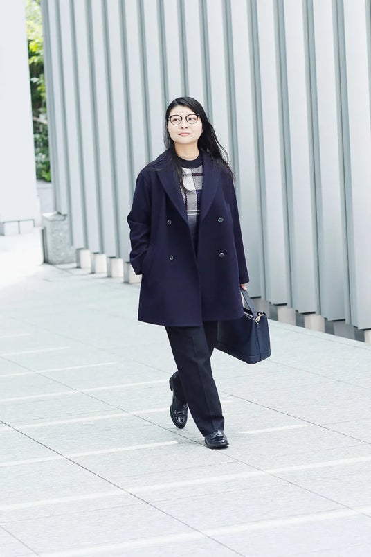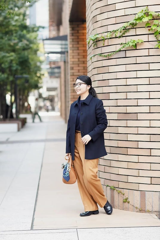 知的で上品な印象のネイビーで、パンツスタイルにピーコートを羽織ったトラッドコーデに。ワンカラーのコーデでは、アイテムの質感に変化をつけていくのがポイントです。トップスにニューヨーカータータンを合わせカラーをプラス。バッグや靴もネイビーでまとめた、ザ・ニューヨーカースタイルです。小物はブラウンではずすのもOK!
