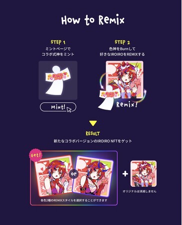 ・特設サイトで、コラボレーション色神のNFTをBurn(消滅)し、キューティーハニーとREMIXするオリジナルのIROIROを選択する