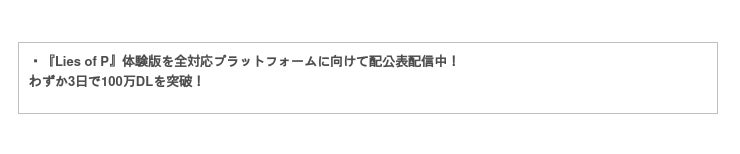 株式会社NEOWIZ (本社:韓国 京畿道城南市、共同代表:金 承徹(キム・スンチョル)/裵 泰根(ベ・テグン)) は2023年9月19日(火)に発売を予定しております『Lies of P』につきまして、去る2023年6月9日に全世界に向け、対応プラットフォーム全てで最新体験版の配信を開始し、2023年6月11日(日)にわずか3日間で世界累計100万DLを突破いたしました。