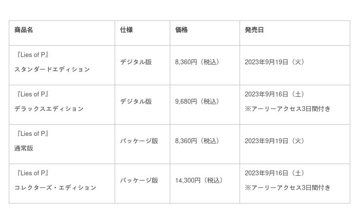 尚、『Lies of P』の発売日は下記となります。仕様により異なりますので、ご予約の際にはご注意ください。