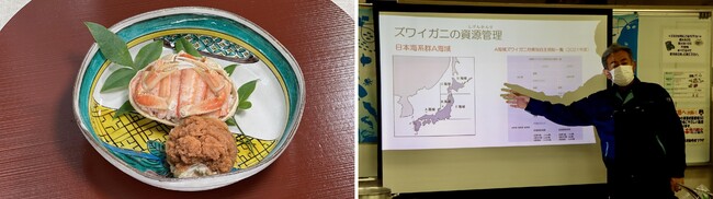 カニを茹でる間にJFいしかわの高岩信広さんから地元のズワイガニ漁についての講義を受けました。漁業においては、限りある水産資源を守るために、魚種によって獲っても良い期間や数量、漁の方法などが定められています。中でもズワイガニは日本海側の6府県が広域で協力することで資源を適切に保護出来ている好事例である、という説明に参加者たちは漁業への関心を深めた様子でした。高岩さんは「漁師さんは獲るだけでなく、水産資源を守る役割も担っている。こうした漁業のことを知って、地元のお魚をもっとたくさん食べてほしい」と話していました。