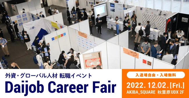ビジネス・プロフェッショナル×バイリンガルのための転職・求人情報サイト「Daijob.com」を展開するヒューマングローバルタレント株式会社(本社:東京都新宿区、代表取締役:横川 友樹、以下「当社」)が、転職イベント「第46回Daijob Career Fair」を2022年12月2日(金)にAKIBA_SQUARE(東京都:秋葉原)で開催するにあたり、出展企業を募集します。