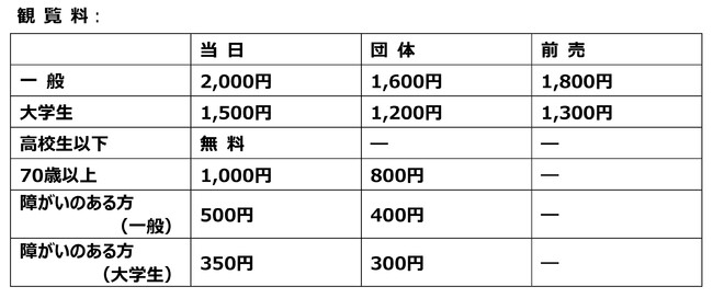 ※高校生以下無料 / ※前売券の販売は2023年3月3日(金)まで / ※団体は20名以上。団体鑑賞をご希望の場合は1か月前までにご連絡ください / ※障がい者手帳等をお持ちの方1名につき、介助者1名は無料 / ※予約制ではありません。混雑時は人数制限を行いますのでお待ちいただく場合があります / ※一般以外の料金でご利用される方は証明書を当日ご提示ください / ※コレクション展は別途観覧料が必要です(本展とあわせて観覧される場合は割引があります) / ※新型コロナウイルス感染症の状況により、会期等予定を変更する場合がございます。最新の情報は展覧会HP等をご確認ください