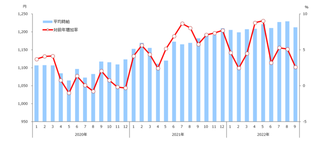 9月のアルバイト・パートの平均時給は1,213円(前年比31円増、前月比17円減)、また求人件数は約259,000件となり、前年比で約1.4倍となりました。