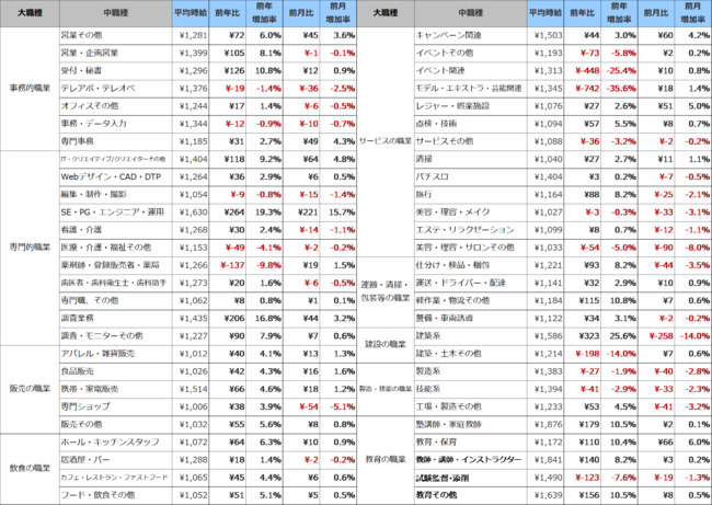 職種別の平均時給は、9職種中6職種の大カテゴリが前年を上回りました。事務的職業は1,369円(前年比51円増、前月比7円減)、専門的職業は1,231円(前年比6円減、前月比7円減)、飲食の職業は1,068円(前年比59円増、前月比9円増)、販売の職業は1,052円(前年比40円増、前月比5円増)、サービスの職業は1,179円(前年比71円減、前月比4円減)、運搬・清掃・包装等の職業は1,207円(前年比89円増、前月比34円減)、建設の職業は1,457円(前年比112円増、前月比197円減)、製造・技能の職業は1,378円(前年比26円減、前月比40円減)、教育の職業は1,781円(前年比153円増、前月比4円増)となりました。