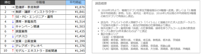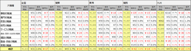 関東エリアの平均時給は1,261円(前年比45円増、前月比10円減)、東海エリアの平均時給は1,190円(前年比46円増、前月比16円減)、関西エリアの平均時給は1,190円(前年比42円減、前月比14円減)、九州エリアの平均時給は1,135円(前年比47円増、前月比23円減)となりました。