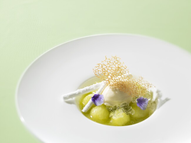 フレッシュなメロンを使用したクープに、レモンのジュレとココナッツのアイスクリームを合わせ、飾りにココナッツのメレンゲとクッキーをのせました。