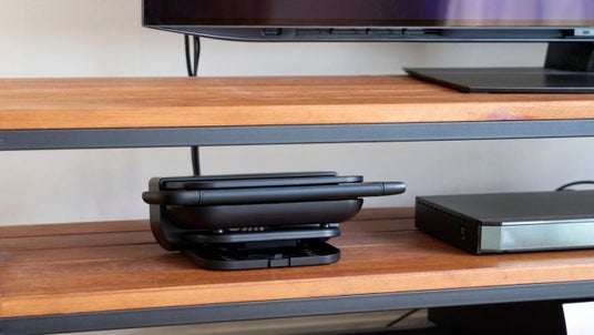 本体底面に設置された送風ファンにより、ドック底面から風を送ることで熱を効率よく排出します。また、縦置き、横置き(4段階角度調節)が可能。横置きの場合、高さ約10cmになるためテレビ台の棚にもすっきり収まります。