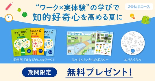株式会社増進会ホールディングス(Z会グループ)のグループ会社である株式会社Z会は、「Z会の通信教育」幼児コースにおいて、「夏の資料請求キャンペーン」を実施中です。幼児コースの資料をご請求いただいた方に、実際の教材を体験できるおためし教材に加え、学年別ワークなどの期間限定特典を無料でプレゼントします。