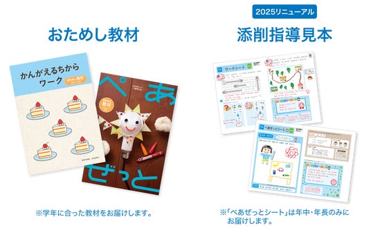 ご入会後に実際にお届けするワーク教材と体験型教材の両方をおためしいただけます。2025年度にリニューアルした添削指導の見本に加えて、年少向けには絵本型教材もお届けします。