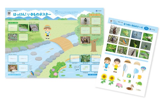 夏の生き物探しに挑戦できる、ポスターとシールのセットです。シールを貼ってポスターを完成させながら、生き物への興味を引き出します。ポスターの裏面には生き物の豆知識も掲載していますので、親子の会話も広がります。