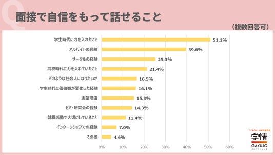 面接で自信をもって話せることは、「学生時代に力を入れたこと」が51.1%で最多。次いで「アルバイトの経験」39.6%、「サークルの経験」25.3%が続きます。「部活動でキャプテンをしていた時の経験や、大会で結果を残した実績について話したい」「授業やアルバイトなど、英語を使ってコミュニケーションをとる機会をたくさん作ってきたので、英語の語学スキルをアピールできると思う」「留学中に、自分が成長したと証明できるエピソードがある」「サークル活動を主体的に取り組んだので、具体的なエピソードを交えて話すことができると思う」「長く続けてきたスポーツについて話すことで、継続力をアピールしたい」などの声が寄せられています。