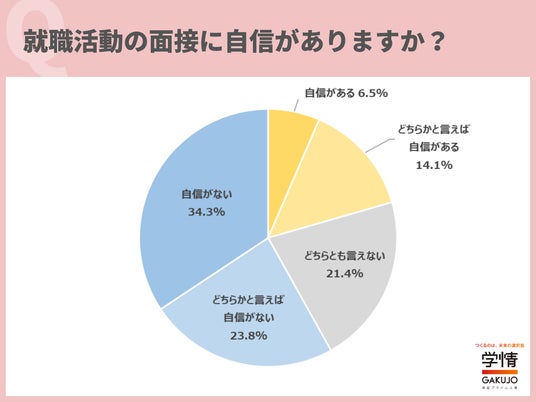 就職活動の面接について、「自信がある」と回答した学生は、6.5%でした。「どちらかと言えば自信がある」14.1%を合わせても、面接に自信を持っている学生は約2割に留まっていることが分かります。「自信がない」「どちらかと言えば自信がない」の回答は、58.1%に上りました。自信があるとした学生からは、「既に何社かの面接を経験している」「課外活動で、人と話すことや自分を表現することをたくさん経験してきた」「かなり対策を重ねてきたため、自信がある」といった声が寄せられました。一方、自信がないとした学生からは、「想定していなかった質問をされた場合に、対応できるか不安」「インターンシップの面接を受けた際に、緊張してうまく話せなかった経験がある」「面接で自信をもって話せるようになるには、もっと自己分析が必要だと思う」などの声が上がっています。