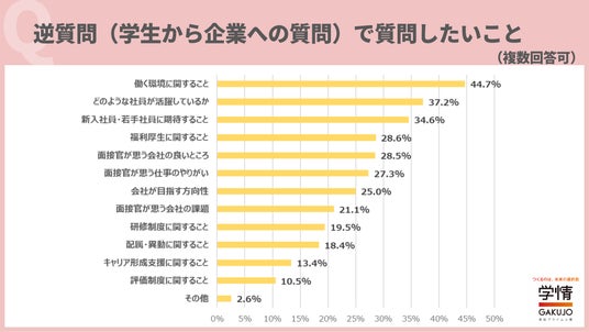 逆質問(学生から企業への質問)で質問したいことは、「働く環境に関すること」が44.7%で最多。次いで、「どのような社員が活躍しているか」37.2%、「新入社員・若手社員に期待すること」34.6%が続きました。「実際に働いている社員の方から、ホームページなどではわからない社風や社内環境について聞きたい」「会社が求める人物像を知り、自分が目指すべき姿や目標を明確にしたい」「会社の方向性と、自身の目指すものが合致するかを知りたい」といった声が上がりました。面接での逆質問を通じて、「社風・環境」や「自身が活躍できそうか」、「キャリアプランと合致するか」などを確かめたいという意向がうかがえます。