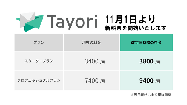 Tayoriでは、2015年のサービス提供から6万を超える多くの方にご利用いただいております。特に中小企業や新規事業では、気軽にDXに取り組みやすい点としても「価格」を挙げていただくことも多くございます。ご利用者の皆様には負担をおかけするものになると考えております。一方で社会情勢の変化によるインフラコストの増大や、ご利用者さまが増す中で安心してお使いいただけるようシステム投資と機能追加を行なっており、持続的なサービスを提供するために今回の価格改定を発表いたしました。今後もより一層ご期待いただけるよう、リリース予定の機能についてもできる限りオープンに開示させていただきました。お問い合わせという顧客との大切な接点をしっかりと管理し、迅速に対応できる環境を整え、引き続き「顧客との信頼関係を築けるサービス」として貢献できるよう邁進してまいります。