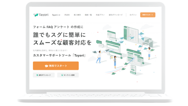 「Tayori」は、少人数でも最適な顧客体験を提供するカスタマーサポートツールです。「フォーム」「FAQ」「チャット」「アンケート」4つの基本的な機能をノーコードで専門知識無く作成・運用できます。2015年からサービス提供開始、アカウント数は2022年11月に6万アカウントを超えています。現在はカスタマーサポートはもちろん、社内業務への活用など、幅広い業種や用途でご利用いただいています。サービス名「Tayori」(読み:タヨリ)には、「お便り」のように大切な想いや願いを届けるサービスでありたいという気持ちをこめています。サービスロゴの紙飛行機は、温かさ、軽やかさ、手軽さ、気持ちをつなげるイメージを表現しています。