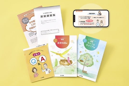 メインテキスト:2冊(基礎知識編、ライフ&キャリア編)、副教材:お悩みQ&A集、重要ポイント動画、ガイドブック、添削関連書類