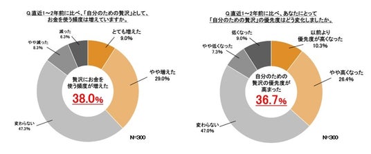 さらに、直近1~2年のお金の使い方を比較すると、物価上昇が続く中でも38.0%もの人が「贅沢にお金を使う頻度」が増えたと回答しました。加えて、「自分のための贅沢の優先度が高まった」と回答した人も36.7%にのぼっています。