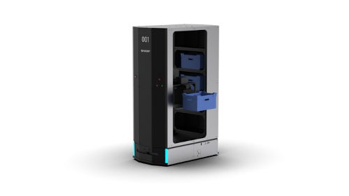 工場や倉庫内の狭い通路でも走行が可能な「スリム型スタッカー自動搬送ロボット」を出展します。幅900mmの狭い通路でも通行でき、スムーズな搬送が可能です。
