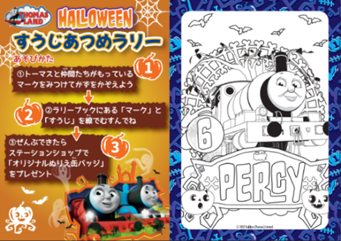 トーマスランド内に設置された5つのパネルを探し、パネルに描かれたお化けやパンプキンなどのアイテムを数えて完成させる「HALLOWEENすうじあつめラリー」を開催。すべてクリアしたお子様には、オリジナルぬりえ缶バッジをプレゼントいたします。ご自宅で好きな色を塗って自分だけの缶バッジを作ってみてください。