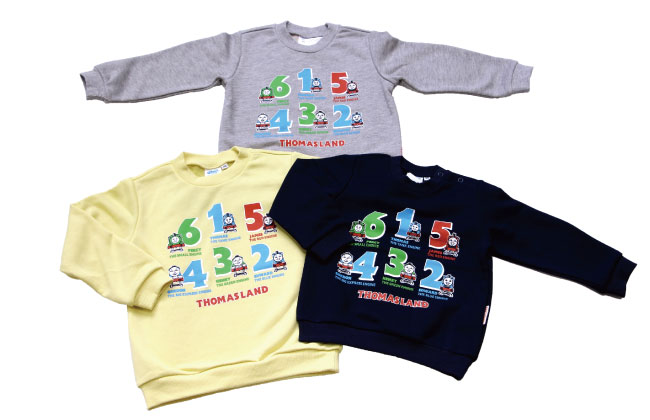 トーマスや仲間たちと一緒にアルファベットや数字が学べるトレーナーを新発売。3つのカラーバリエーションから選べ、可愛い見た目はもちろん着ていて楽しくなる商品です。これからの季節にぴったりなトレーナーとなっておりますので、ぜひご注目ください。