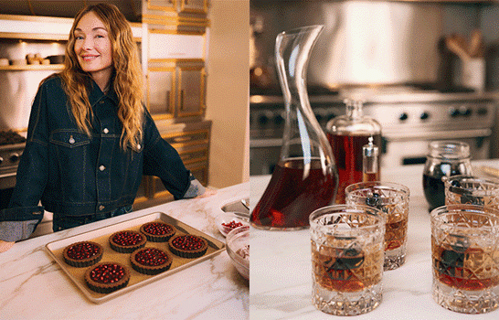 インテリア デザイナーのケリー・ウェアスラーによる、華やかで温もりあふれるサンクス ギビングの準備風景をご紹介します。デニムのジャケットとパンツに身を包んだケリーはお気に入りのレシピのひとつ、チョコレートとザクロのタルトを披露。甘くグルメなデザートに、「カリフォルニア クラシック」というカクテルを添えました。テーブルセッティングはマリア・グラツィア・キウリによるディオール 2024年クルーズ・コレクションのためにピエトロ・ルッフォが考案した「ディオール アラウンド ザ ワールド」のモチーフを再解釈した「トワル ドゥ ジュイ」と組み合わせたリモージュ製のプレート。今にも飛び立ちそうな美しいバタフライが、ディナープレートやデザートプレートに羽を広げます。