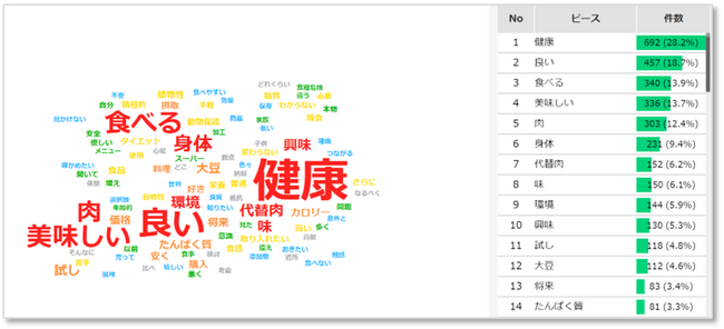 近年、スーパーなどでも代替肉製品を手軽に購入できるようになりました。健康意識の高まりや環境問題を背景に利用する人が増えているようです。そのため当社では「代替肉に関するアンケート調査(第2回)」を実施し、代替肉の喫食意向の理由4,781件の自由回答データを元に、弊社テキストマイニングツール「TextVoice」で分析したので、その結果をご紹介します。