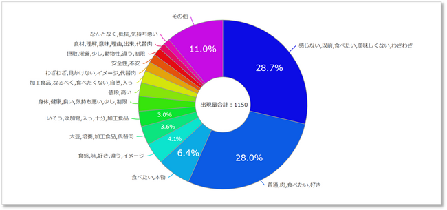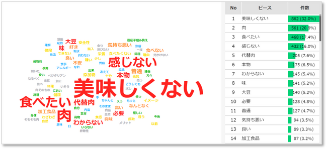美味しくない、(肉を)食べたい、(肉を)感じないといったワードが上位にきています。