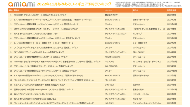 ホビーショップ『あみあみ』の「2022年11月フィギュア予約ランキング」を発表!